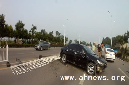 安徽新闻网(www.ahnews.org)讯:昨天下午16时52分点左右,308省道淮南市八公山区王巷村路段,一辆由东向西行进的黑色江淮牌汽车突然爆胎,车辆失控撞损路中阻隔护栏,然后冲破护栏又撞上了相对方向车道上一辆正在行进的白色福特汽车,致福特汽车左后部受损,所幸无人员伤亡。