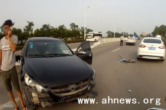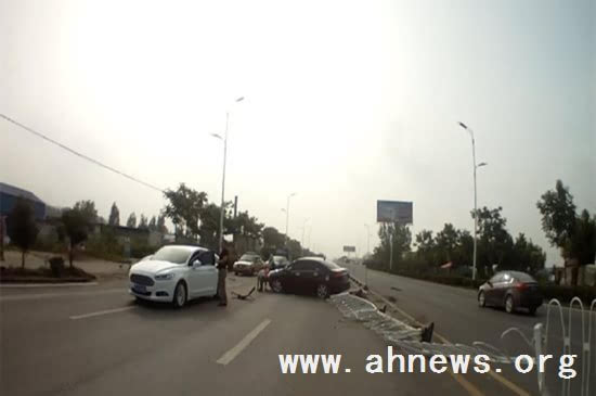 事发地点在淮南市八公山区王巷村路段,事发时八公山交警大队民警正在用警务车布控查办交通违法行为,事端发生进程被监控视频全程拍照。这辆正在行进的黑色江淮牌皖DC871*号汽车左前胎突然爆胎,失控后的汽车刹那间冲向马路中心的护栏,在撞断了路中6节护栏后车头又撞上了相对方向正常行进的一辆福特车左后部,所幸江淮汽车内三位大人和两个小孩无一人伤亡。